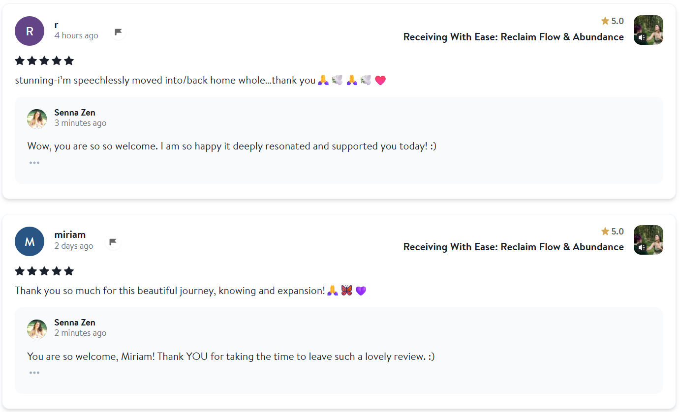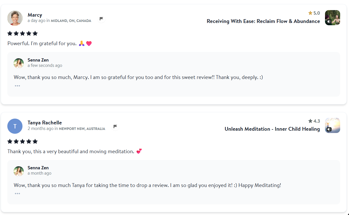 "I was guided through a powerful mental and sensational mind and heart journey. Excellent meditation experience, I look forward to practicing this again! Thank you Senna."